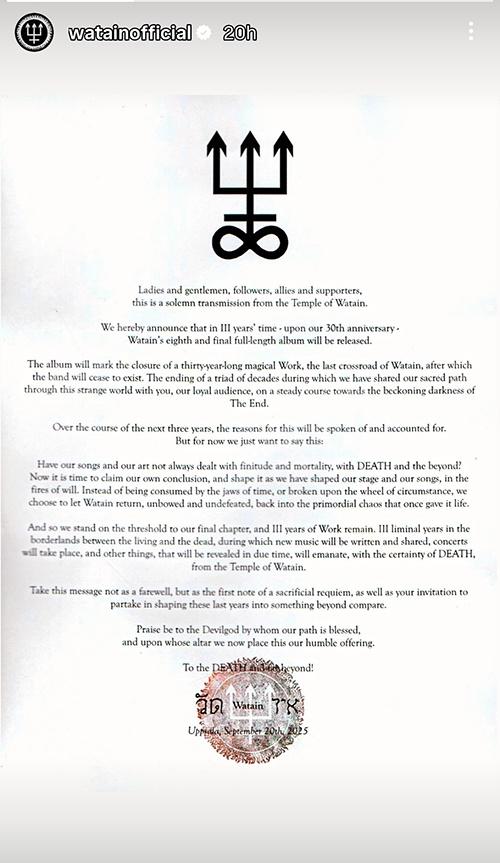 Rocket 7 months ago WATAIN announced that it will release its 8th and final album in three years. The famed black metal band will be celebrating their 30th anniversary during that time. It is unknown if the band will announce a tour in support. Post navigation Previous ARCH ENEMY – Debut New SingleNext Kid Rock – Banned From Performing In California Due To “His Horrific Music” More Stories METAL NEWS DOWN And SUICIDAL TENDENCIES To Headline Decibel Magazine Metal & Beer Fest: Denver 2026 2 hours ago Rocket METAL NEWS Shane Embury – Solo Song Premiere 2 hours ago Rocket METAL NEWS JUNGLE ROT – Debut New Music Video 5 days ago Rocket